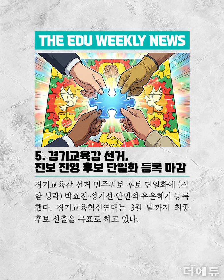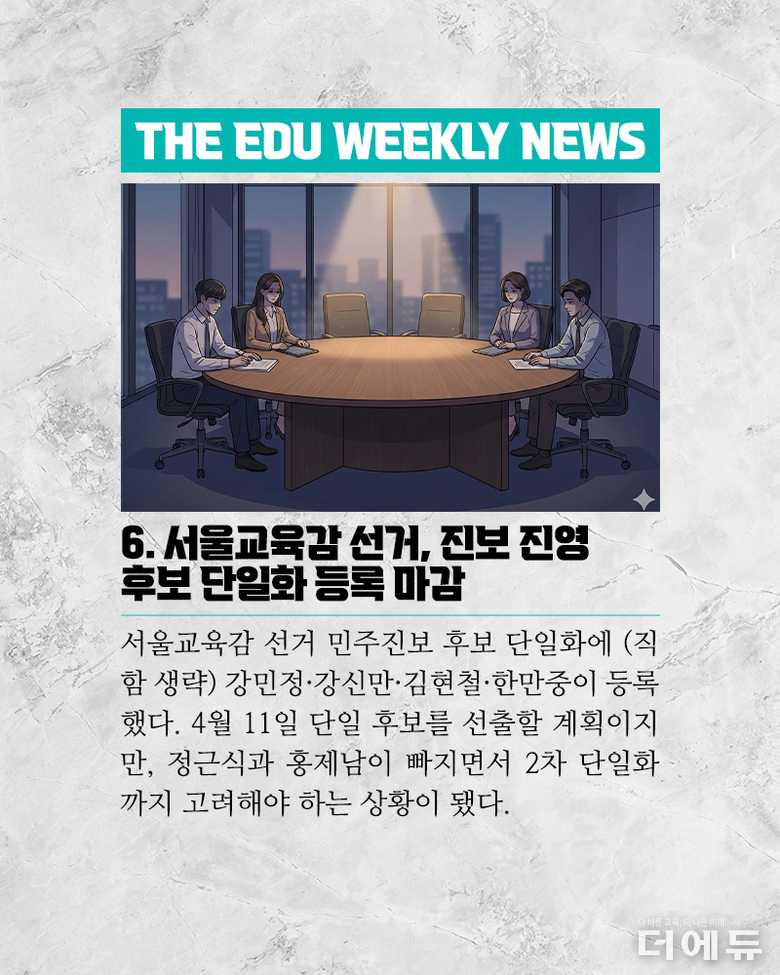 더에듀 지성배 기자 | 각 지역 교육을 이끄는 교육감 협의체인 전국시도교육감협의회가 올해 대한민국교육감협의회로 명칭을 바꾸고 제2의 도약에 나섰다. 강은희 대구교육감이 회장을 맡은 지 1년 7개월, 그새 정권은 바뀌었고, 오는 6월에는 지방선거라는 중차대한 일정이 자리잡고 있다. 교육계에서는 광역시도 통합 이슈가 관통하고 있으며, 학력인구 감소, 지역 소멸, 교육재정, 그리고 입시, 교육의 디지털화 등 다양한 아젠다가 켜켜이 쌓이고 있다. 이에 <더에듀>는 새학년 시작을 앞두고 강은희 대한민국교육감협의회 회장과 우리나라 교육계에 닥친 이슈를 진단하고 교육이 나아가야 할 방향에 대한 혜안을 얻고자 한다. 인터뷰 영상은 두 편으로 나눠 송출되며, 두 번째는 '교육 현안'이다. 사회 = 지성배 더에듀 편집국장 촬영 및 편집 = 장덕우 더에듀 콘텐츠 실장 1편 = 광역시도 행정 통합(https://www.te.co.kr/news/article.html?no=28019)