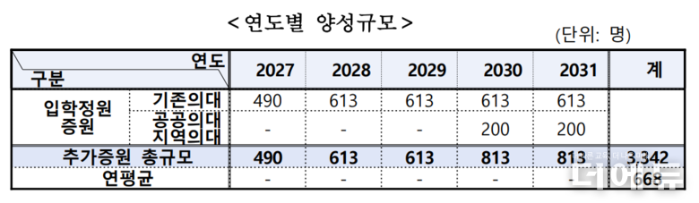연도별로 2027년 490명, 2028년 613명, 2029년 613명, 2030년 813명, 2031년 813명 늘린다. 연평균 668명이다. 연 200명 규모의 공공의대와 지역의대 양성 인력은 2030년과 2031년 포함됐다.