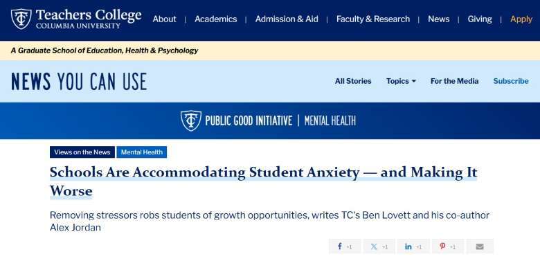 벤 로베트(Ben Lovett) 컬럼비아대 교육심리학 교수와 알렉스 조던(Alex Jordan) 하버드대 의대 강사가 쓴 칼럼으로 ‘학교가 학생의 불안을 조정하면서 조장한다(Schools Are Accommodating Student Anxiety — and Making It Worse)’는 제목의 칼럼이다.
