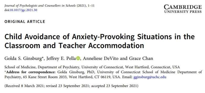 마지막으로 골다 긴즈버그(Golda Ginsberg) 코네티컷대 의대 정신의학과 교수 등이 2021년에 ‘학교 심리학 및 상담사 학회지’에 실은 ‘교실 내 불안 유발 상황에 대한 아동의 회피와 교사의 편의 제공(Child Avoidance of Anxiety-Provoking Situations in the Classroom and Teacher Accommodation)’ 논문을 살펴보자.