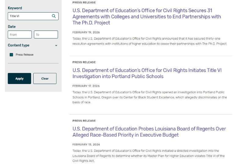 17일에는 오리건주의 포틀랜드 공립 교육구에 관한 감사를 시작했다. 교육구 내 ‘흑인 학생 수월성을 위한 센터(Center for Black Student Excellence)’가 마찬가지로 민권법 6편을 위반했다는 민원 때문이다.