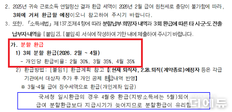 <더에듀> 취재에 따르면, 서울·충북·대구교육청 등은 공문을 통해 연말정산 환급 세액은 월별 분할로 지급한다고 현장에 안내했다. 교육청에 따라 2월부터 월별 30/35/35% 또는 30/30/40% 등 비율은 교육청에 따라 다르다.