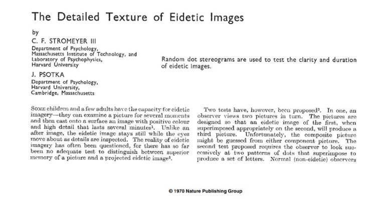 그러다 1960~70년대에 다시 부흥기를 맞는다. ‘사진 기억력’의 가장 대표적 연구는 1970년에 네이처지에 실린 ‘직관상 이미지의 상세한 질감(The Detailed Texture of Eidetic Images)’이다. MIT와 하버드대 연구원이었던 찰스 스트로마이어 3세(Charles Stromeyer III)와 하버드대 연구원이었던 조세프 프소트가(Joseph Psotka)의 공동 연구이다.