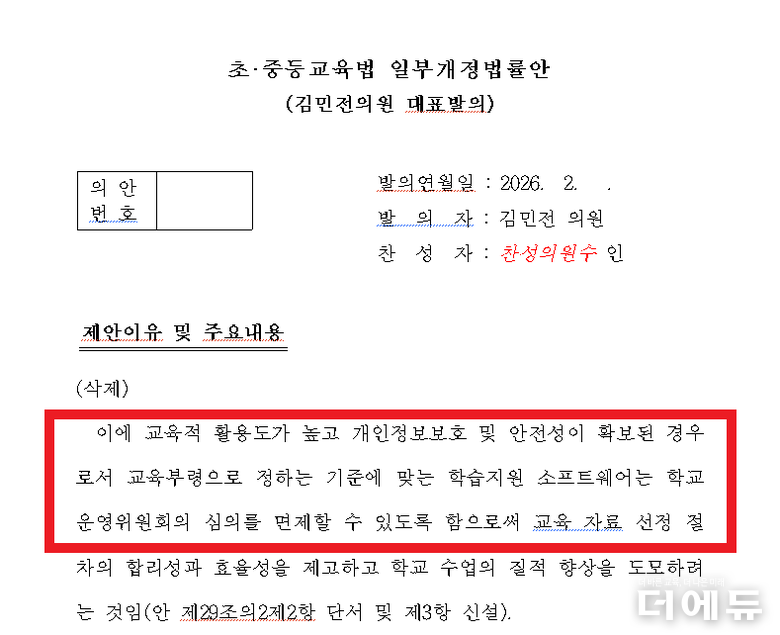 더에듀 지성배 기자 | 대통령령으로 학습지원 소프트웨어의 학교운영위원회(학운위) 심의 면제를 풀 수 있는 내용의 법안이 발의됐다. 대한초등교사협회(대초협)가 주도한 제1호 법안이라는 상징성을 담고 있다.