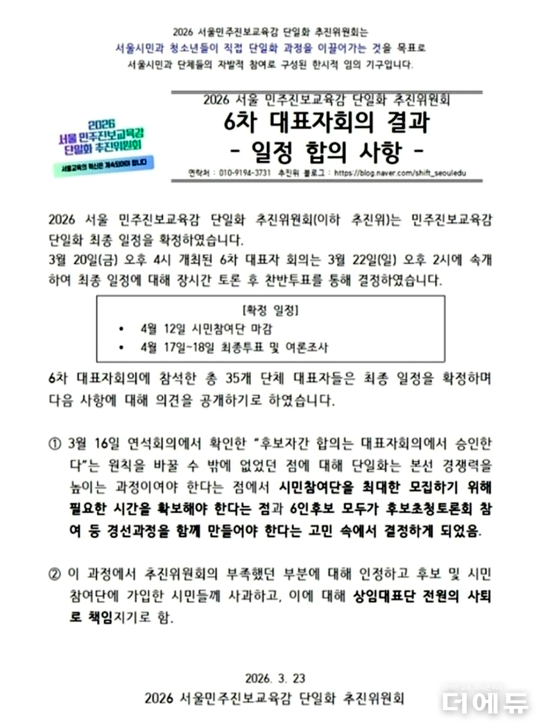 더에듀 김연재 기자 | 서울교육감 진보진영 단일화 기구인 2026서울민주진보 단일화 추진위원회(추진위)가 22일 기존 단일화 경선 일정을 연기하자, 이을재 경선 후보자는 24일 ‘후보 6인 연석회의’를 열고 단일화 경선 일정 토의를 제안했다. 정근식 서울교육감을 제외한 경선 후보 5인은 27일 열리는 전체회의에서 ‘결선투표제’ 도입을 요구할 예정이다.