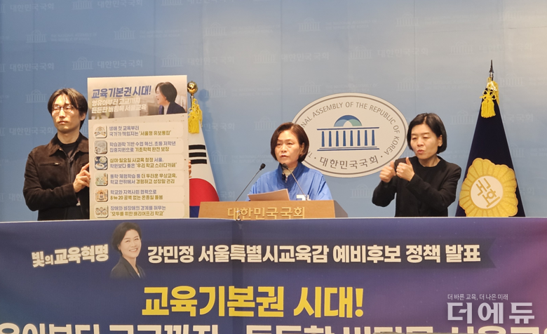 더에듀 김연재 기자 | 강민정 서울교육감 예비후보가 27일 국회에서 학생들의 마음건강 지원, 유보통합 확대, 사교육 완화, 무상교육 실현, 특수교육 및 장애인 교직원 지원 강화 등이 담긴 2호 공약 ‘교육기본권 시대! 영유아부터 고교까지 든든한 버팀목 서울교육’을 발표했다.
