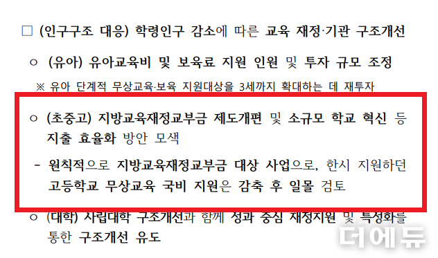 정부는 이중에서 우선 고교무상교육 국비 지원은 감축 후 일몰까지 검토하기로 했다. 고교무상교육비는 입학금과 수업료, 교과서비, 학교운영비 등을 전액 면제하는 제도록 2019년 한시법으로 도입돼 2024년 일몰됐으나 국회는 지난해 연장법안을 통과시켜 2027년까지 효력을 유지한다.