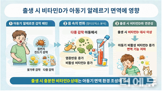 연구 결과, 다중 감작 아동(여러 알레르기 항원에 동시에 민감한 아동)의 혈액에서 비활성형 비타민D가 증가한 것으로 나타났다. 비활성형 비타민D는 체내에서 바로 작용하지 못하는 상태로 활성 형태로 바뀌어야 기능을 한다.