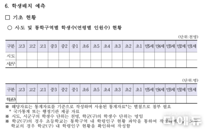 자료는 시·도, 시·군·구, 학군(구)까지 제출하라고 하지만, 학군(구) 정보 중 만 1세부터 5세까지의 정보를 지원청이 확보할 방법은 없습니다. 시군구도 인구정보를 제공할 근거 규정이 없습니다. 따라서 교육지원청은 부정확한 정보로 신청할 수밖에 없습니다.