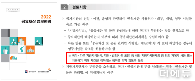 지방자치단체의 부동산은 행정안전부에서 만든 ‘공유재산 업무편람’이라는 매뉴얼을 따라야 합니다. 여기서는 국가·다른 지방자치단체 등 해당 지방자치단체의 장 외의 자에게 사용 또는 처분하기 위해 재산을 취득하는 행위를 하지 않도록 하고 있습니다.