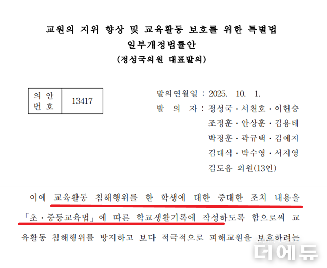 법안을 발의한 정성국 의원도 “교권 침해 학생부 기록 의무화 법안은 반드시 통과돼야 한다”며 “처벌 강가 아닌 학생들에게 분명한 기준가 책임을 인식시키고 교실의 안전과 다수 학생의 학습권을 지키기 위한 최소한의 장치”라고 강조했다.