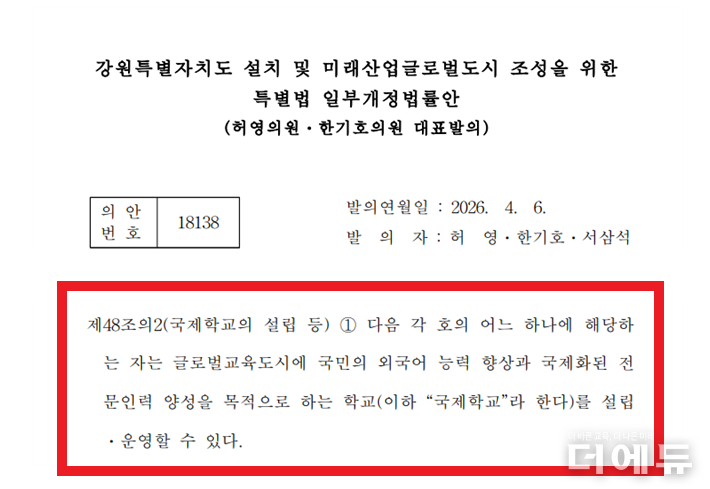 허영 더불어민주당 의원과 한기호 국민의힘 의원은 지난 6일 ‘강원특별자치도 설치 및 미래산업글로벌도시 조성을 위한 특별법(강원특별법)’ 4차 개정안을 공동 발의하며 국제학교 설립 특례를 포함했다.
