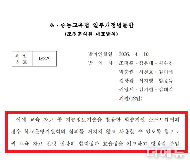 한편, 지난달 5일 김민전 국민의힘 의원(국회 교육위원회)도 학습지원 소프트웨어의 학운위 심의 면제를 담은 초중등교육법 개정안을 발의했다. 김 의원의 법안은 교육부장관이 선정한 소프트웨어만 제외하기로 해 조 의원 법안과 차이가 있다.