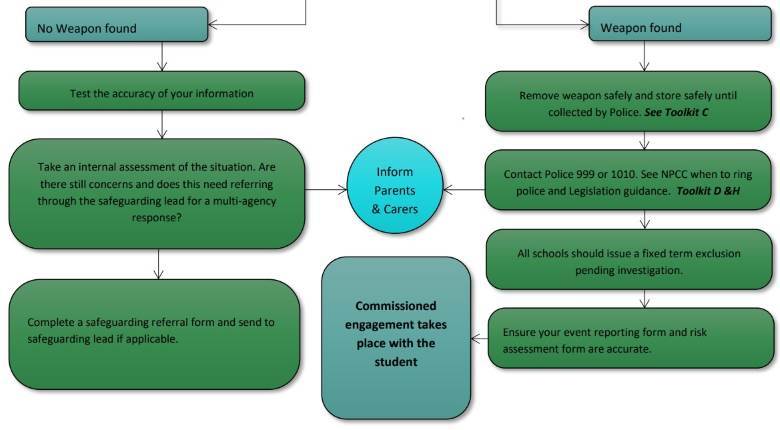 사안이 발생하면 영국은 학교에서 경찰이 상주하는 지역이 많고 소지품 검색이 가능해 대부분은 현장에서 즉시 체포와 증거 수집이 이뤄진다. 또한, 도검류 사안은 사소한 것이라도 반드시 경찰에 보고하게 돼 있다.