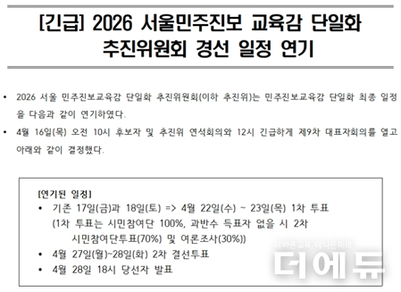 ‘2026 서울 민주진보교육감 단일화 추진위원회(추진위)’가 1차 경선 투표일을 17~18일에서 22~23일로 연기했다. 이에 따라 1위 후보자가 과반 이상 득표하지 못했을 경우 진행하는 2차 투표도 27~28일로 밀렸다.