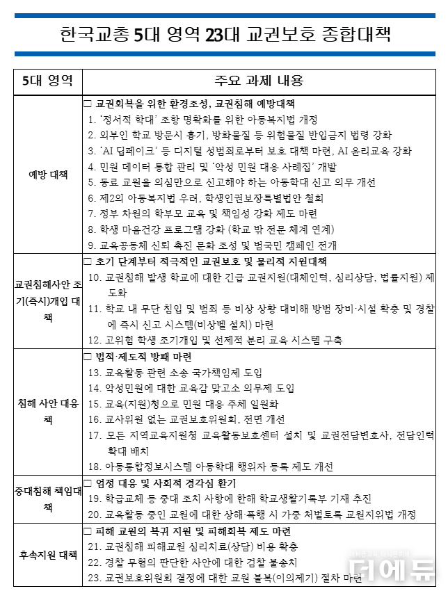 더에듀 지성배 기자 | 교권침해 중대 조치 사항 학교생활기록부(학생부) 기재를 둘러싸고 교원단체 간 이견을 보이는 가운데, 한국교원단체총연합회(교총)가 이를 포함한 5대 교권보호 대책의 전국교원청원서명에 돌입한다.