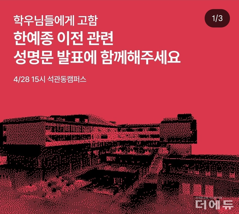한예종 제30대 총학생회 ‘새:틀’은 오는 28일 오후 3시, 한예종 석관동 캠퍼스 이어령예술극장 앞에서 성명서를 발표한다고 27일 홍보하고 있다.