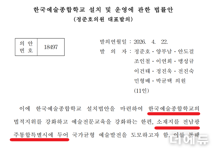 한편, 지난 22일 정준호 더불어민주당 의원은 “지역 청년 예술인들의 수도권 유출로 지역 문화예술 생태계가 위축되고 있다”며 “한예종 소재지를 전남광주통합특별시에 두어 국가균형 예술발전을 도모하고자 한다”고 법안 발의 이유를 밝혔다.