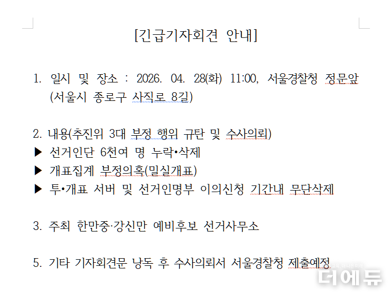 강·한 예비후보는 오는 28일 오전 11시, 서울경찰청 앞에서 기자회견을 연다고 밝혔다.