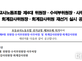 더에듀 지성배 기자 | 투표율 미달로 재선거를 치르게 된 초등교사노동조합(초등노조) 제4대 위원장 선거에 후보가 늘어 각축전이 예상된다. 초등노조는 12월 29일~내년 1월 5일까지 제4대 위원장 선거를 진행한다. 지난 달 27일 마무리된 선거가 투표율 50%를 넘지 못하면서 재선거가 됐다. <더에듀> 취재 결과, 재선거 출마를 위한 후보 등록은 오늘(19일) 저녁 9시까지이며, 이미 지난 선거에 출마했던 ▲강석조 인천 운서초 교사 ▲고요한 인천 청호초 교사 ▲김희성 서울 선곡초 교사에 더해 ▲박교순 경기 마지초 교사가 후보 등록을 마쳤다. 초등노조는 현재 3만 7000명 정도의 조합원을 보유하고 있어 급별 최대 노조로의 위상을 갖고 있으며, 직선제로 위원장을 선출한다. 이번 선거는 러닝메이트인 수석부위원장·사무처장을 함께 뽑는다. 또 회계감사위원장과 회계감사위원의 재선거도 함께 실시한다. 내일(20일) 등록한 후보자들이 기호를 추첨하며, 선거운동 기간은 20일~28일이다.