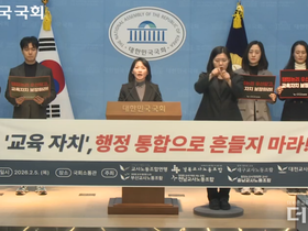 더에듀 지성배 기자 | 송수연 교사노동조합연맹(교사노조) 위원장 당선인의 첫 공식 행보는 행정통합 규탄 기자회견이었다. 송 위원장 당선인은 5일 국회에서 기자회견을 열고 행정통합이 속도전으로 흐르고 있어 교육자치의 근간이 흔들리고 있다며 입법 중단을 촉구하고 나섰다. 이번 기자회견에는 행정통합이 추진되는 대전·충남·전남·대구·부산 지역 교사노조 관계자들이 함께 했다. 송 당선인은 “교육감의 권한이 교육재정의 안정성이 지차제장의 권한과 조례로 넘겨지고 있다”며 “교육을 행정 편의의 영역으로 끌어들이는 위험한 시도”라고 비판했다. 이어 “교사, 학부모, 학생 등 교육 주체의 목소리가 배제된 현 상황은 민주적 절차의 결여”라며 “교육이 흔들리는 통합은 지속가능하지 않으며, 그 피해는 고스란히 지역 학생들에게 돌아갈 것”이라고 우려했다. 이윤경 대전교사노조 위원장은 “대전충남행정통합특별법안은 교육을 논외로 취급했다”며 불편함을 드러냈고, 김선희 충남교사노조 사무처장은 “전교생 60명 이하 학교가 전체의 3분의 1을 넘는데 법안은 오직 효율의 잣대만 들이대고 있다”고 비판했다. 이들은 구체적으로 ▲교육장 자격·임용 기준 조례로 위임 ▲특목고·영재학교 설립 권한 시장에
