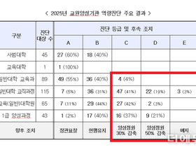 더에듀 지성배 기자 | 연세대 미래캠퍼스와 한양대 ERICA, 협성대의 교직과정이 폐지된다. 고려대 교직과정과 부산외대 교육대학원, 중앙대 1급 양성과정 등은 양성 정원의 50% 감축 처분을 받았다. 이로써 약 3000명의 양성기관정원이 감축된다. 교육부는 6일 이 같은 내용이 담긴 ‘2025년 6주기 교원양성기관 역량진단 결과’를 발표했다. 역량진단은 미래교육 역량을 갖춘 예비교원 양성을 위해 교육여건, 교육과정, 성과 등을 종합 평가하는 것이다. 이번 6주기 진단은 사범대학 설치 대학과 미설치 대학 총 1239개교의 최근 3년(2022~2024) 실적을 대상으로 진행됐다. A등급은 장관 표창, B등급은 현행 유지, C등급은 양성정원 30% 감축, D등급은 양성정원 50% 감축, E등급은 폐지된다. 진단 결과 연세대 미래캠퍼스와 한양대 ERICA, 협성대의 교직과정은 E등급을 받아 폐지 대상이 됐다. D등급은 고려대 교직과정 등 22개 대학, 부산외대 등 2개 교육(일반)대학원, 중앙대 등 9개 1급 양성과정이다. 이들은 양성정원 50% 감축이다. C등급은 동양대 유아교육과 등 4개 일반대학 교육과, 한양대 교직과정 등 47개 대학, 성균관대 교육대학원 등
